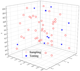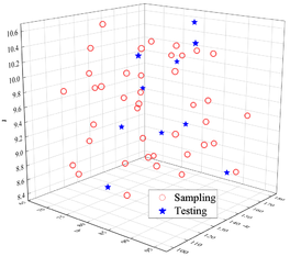 According to the construction process of the surrogate model in Figure 5, the range of design variables was determined after analyzing the problem, and DoEs can be performed using sampling methods. There are several typical sampling methods, such as Latin hypercube sampling (LHS) [16], full factorial design (FFD) [17], orthogonal array (OA) [18], and central composite design (CCD) [19] methods. In this paper, the LHS method was used to generate training and testing samples in the design space. 50 points were selected and the corresponding maximum stress and maximum total deformation under the relevant loads were calculated using simulation. The 50 points are divided into two groups, 40 points are used for training surrogate models and the remaining 10 points are used for testing the built surrogate models. 40 training points and 10 testing points are illustrated in Figure 5. In Figure 5, , , , and are design variables shown in Figure 3(a). It can be clearly seen that the training and testing points are distributed over almost the whole design space with good space filling property and projection. The testing points and training points are in the same design space, which does not involve the problem of external interpolation, while the testing points and training points are interspersed with each other, indicating that distribution of sampling points can meet the requirements.