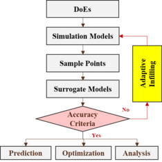 The typical constructing process of surrogate models is shown in Figure 4, which mainly includes design of experiments (DoEs), generation of sampling points, construction of surrogate models, accuracy evaluation and application. If the accuracy of surrogate models cannot meet the requirements of the accuracy criteria, new sampling points generated by adaptive infilling method should be added into the initial sample set. Four typical individual surrogate models are briefly introduced next, and relevant theory is detailed in references [7-10].