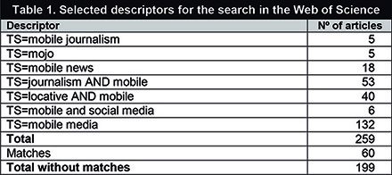 We worked with inclusion criteria consisting on keywords defined for mobile journalism, the subject of study, and published in English in the period 2008-18. Articles in which the main goal was not related to mobile journalism have been excluded as, for instance, those related to technical aspects of devices and those that affected media literacy processes. The procedure to conduct the review consisted in the selection of studies in the area of Social Sciences through the Web of Science database. This choice is justified because the main objective is to assess articles published in journals with the highest impact at the international level. In order to locate the results, the following categories, collected in Table 1 (next page), were taken into account: