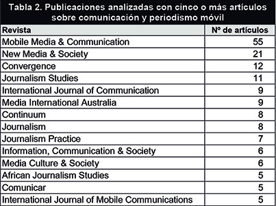 A lo largo de los diez años estudiados han sido 31 las publicaciones que han recogido en sus páginas textos centrados en la comunicación y el periodismo móvil ajustados a los criterios de búsqueda establecidos para la presente revisión. Sin embargo, la tendencia dentro de esta temática es la concentración de las investigaciones en cuatro cabeceras que aglutinan casi la mitad de las investigaciones existiendo, por tanto, una cierta especialización o tendencia de los autores a la comunicación de sus resultados de investigación a través de «Mobile Media & Communication», «New Media & Society», «Convergence» y «Journalism Studies», todas ellas muy vinculadas al estudio de la influencia de la tecnología en los procesos comunicativos.
