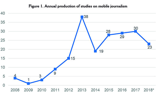 Del estudio de la producción de artículos académicos sobre periodismo móvil obtenidos a través de la búsqueda de diferentes descriptores en la base de datos Web of Science se ha hallado que a lo largo de los últimos diez años se ha producido un progresivo incremento en el volumen de la misma. Así, se ha pasado de las cuatro referencias encontradas en el año 2008 a las 23 existentes a mediados del año 2018.