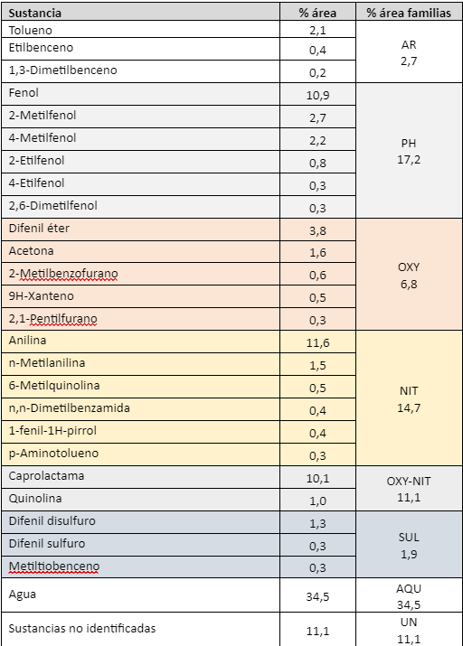 AR: compuestos aromáticos; PH: compuestos fenólicos; OXY: otras sustancias orgánicas oxigenadas; NIT: sustancias orgánicas nitrogenadas; OXY-NIT: sustancias orgánicas oxigenadas y nitrogenadas; SUL: sustancias orgánicas sulfuradas; AQU: agua; UN: sustancias no identificadas.