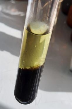 En la Figura 1 se puede observar el aspecto de la fase condensada de la pirólisis de algunos residuos de FRP, donde se puede apreciar la coexistencia del aceite de pirólisis (sustancia más oscura), la fase acuosa (sustancia más clara) e incluso fases semi-sólidas compuestas por sustancias de alto peso molecular.