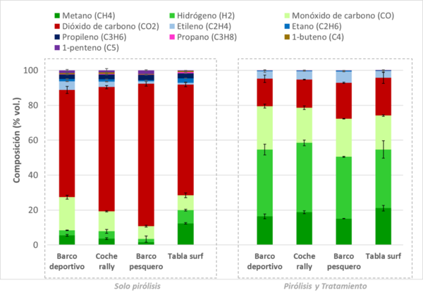 Bajo las condiciones de este tratamiento, la cantidad de gases de pirólisis aumenta de manera equivalente a la disminución de la fase líquida, por lo que el gas de pirólisis pasa a ser el producto principal de entre los dos. Además, las reacciones secundarias que tienen lugar en el segundo reactor modifican positivamente la composición del gas, provocando un aumento considerable de la proporción de hidrógeno y una disminución equivalente de la proporción de CO2. En la Figura 4 se puede apreciar el mencionado cambio en la composición, que se produce de manera similar independientemente del tipo de residuo tratado y supone unas concentraciones de hidrógeno en los gases del orden del 40 % en volumen.