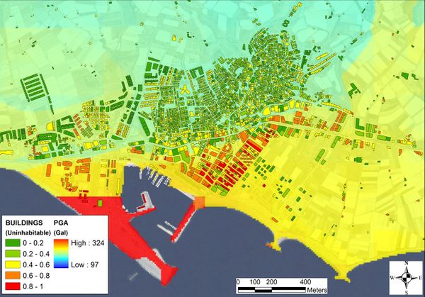 | Figure 4. Simulation example obtained by SISMOTOOL for the Adra earthquake of 1910. The buildings colour represents the uninhabitability, on a base rater map that represents the PGA |