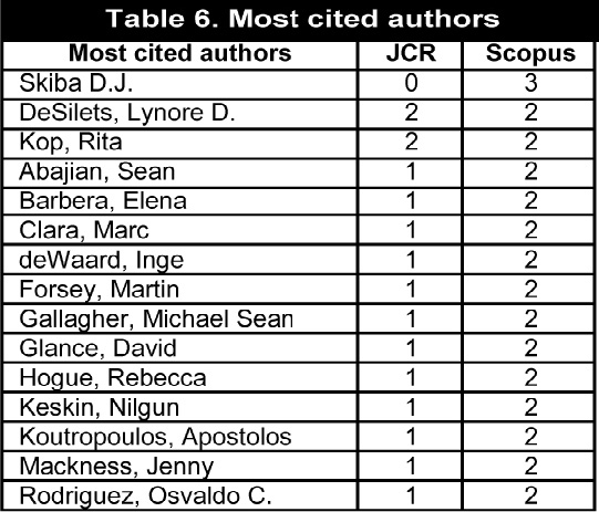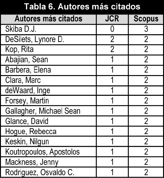 En la tabla 6 presentamos el impacto de los autores más citados en las dos bases de datos que como se puede observar es muy bajo. Por ejemplo, la profesora Rita Kop (Yorkville University, Canadá) con su artículo «The Challenges to Connectivist Learning on Open Online Networks: Learning Experiences during a Massive Open Online Course» solo recibe dos citas en cada una de las bases de datos, mientras que en Google Scholar recibe 98 citas de este mismo artículo. Lo que implica que la repercusión en bases de datos de alto impacto es todavía muy poco significativa.