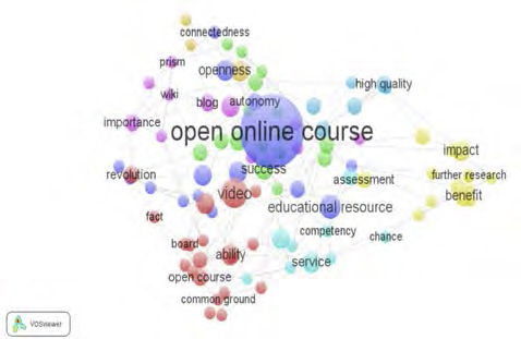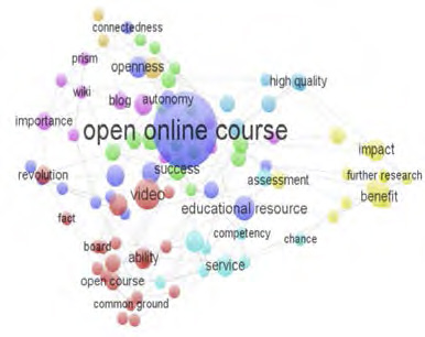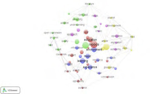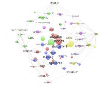 Once the descriptive and quantitative analysis of the impact of MOOC movement in both databases was implemented, we conducted an analysis of the relations established between keywords through a graph representation. We then chose the words «Abstract» and «Keywords» as the basis for obtaining the word network once the article has been uploaded to the archive, and for the development of binary count, we considered a minimum of two items:
