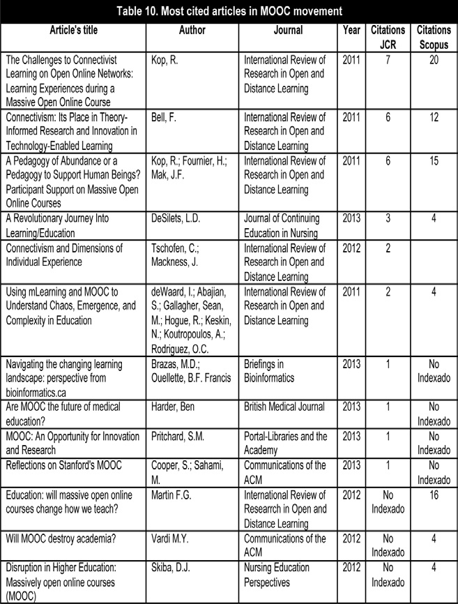 The theoretical approach of the articles with the highest citation index in both databases shows that MOOC research is still at an early stage, and the efforts made to date focus more on the informatics field than on the scientific and academic context (table 10). Some of the biggest names in MOOC research, such as George Siemens, Stephen Downes, and Sir John Daniel who have more than 200,000 search results on Google about MOOCs, have not yet published high-impact articles in these two databases.