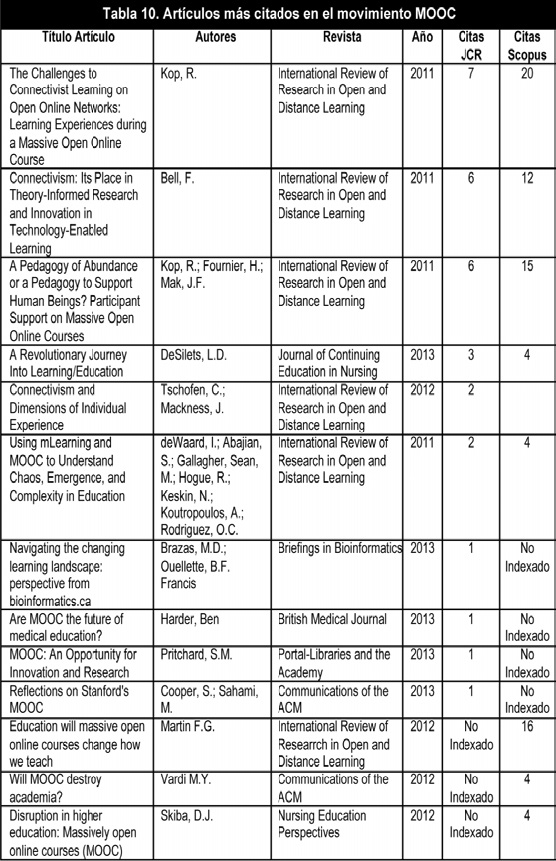 Este enfoque teórico de los artículos con mayor índice de cita en ambas bases de datos muestra que la investigación sobre los MOOC está aún en una fase inicial, y los esfuerzos que se han realizado hasta la fecha, se centran más en el ámbito divulgativo que en el científicoacadémico (Tabla 10). Es reseñable que algunos de los grandes nombres de la investigación MOOC, como pueden ser: George Siemens, Stephen Downes y Sir John Daniel que acumulan entre los tres más de 200.000 resultados de búsqueda en Google sobre MOOC, no hayan publicado artículos de alto impacto en estas dos bases datos.
