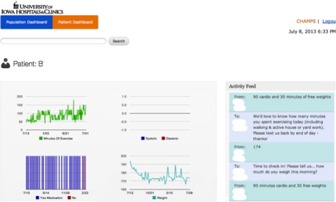Text messages were sent three to five times per week and consisted of heart-healthy tips, requests for weight and BP input, minutes of exercise per day, and medication adherence. Participant responses were graphed and staff was notified of abnormal BP measurements and/or when a participant had not responded for 30 days. Fig. 1 illustrates data the OP-CR staff could observe online when logged in to the HealthCrowd site, which was password-protected. While messages are sent by the vendor, any staff member can interact with all patients or with individual patients as desired. Staff members of the OP-CR program were able to access the site as often as desired; at least one staff member did so at least twice per day. Individual patient data was accessible with name selecting his/her name (Fig. 2).