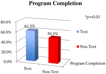 Fig. 3. Program completion. Significantly more patients in the texting program (61.54%) than non-texting (50.27%) completed the program. It should be noted that in the 17 months prior to the study, only 46.5% of all patients completed the program. For patients < 70 years of age, only 44.9% completed the program. |