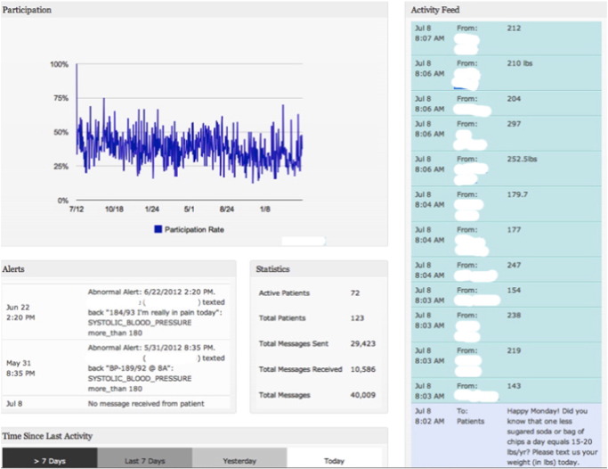 Fig. 1. Example of what the cardiac rehabilitation staff visualizes after logging in to HealthCrowd site. Top graph, left illustrates participation rate. “Alerts” (lower left) illustrates abnormal BP and notifications of patients who have not responded. “Statistics” (lower center) illustrates total messages sent to date, number of patients and number of messages received. The “Activity Feed” illustrates messages sent (lower right) and participants who have responded to the statement sent to all patients, “Happy Monday! Did you know that one less sugared soda or bag of chips a day equals 15–20 lbs/year? Please text us your weight (in lbs) today.” The responses for each patient are then graphed. |