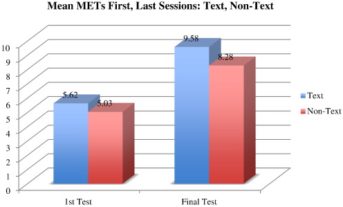 Fig. 4. Mean METs achieved on the first and final sessions. Both Tx and NTx had significant increases in peak METs on first and final sessions (p = 0.0001). The Tx group increased 70%, from 5.62 METs (n = 52) to 9.58 METs (n = 30), whereas the NTx group increased 65%, from 5.03 (n = 184) to 8.28 METs (n = 92). Wilcoxon scores (rank sums) for variable METs were classified by variable, Tx. Average scores were used for ties. For the first test, normal approximation: Z 2.2889; two-sided Pr > [Z] 0.0221. METs for the final test: Z 1.8894; two-sided Pr > [Z] 0.0588. |