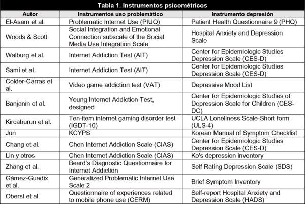 En cuanto a los instrumentos para medir tanto el uso problemático de Internet como la depresión, se observa la Tabla 1.