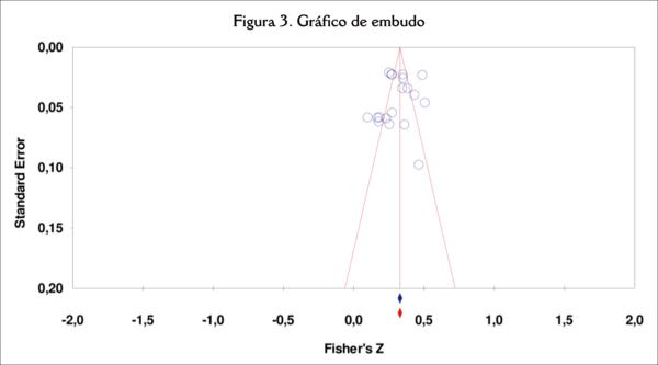 Debemos tener en cuenta que 3 estudios se alejan de la figura claramente. Estos son aquellos que presentan datos más extremos, si bien vale resaltar que, al realizar la transformación de una curva normal a la curva de Fisher, los valores mayores que 0,5 sufren cierta deformación, de manera que todavía los aleja más de la media.