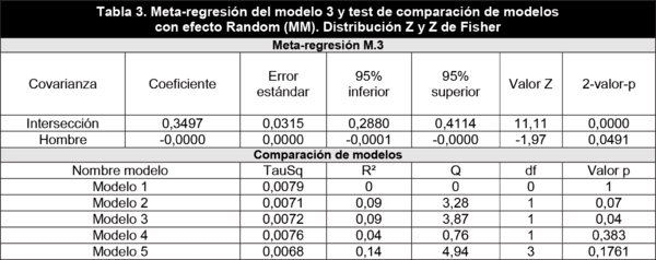 Se establecieron variables moderadoras para estudiar la variabilidad de las investigaciones (Botella & Sánchez, 2015). En este sentido, se determinaron tres: sexo, edad media y cultura (Europa, Euroasia, América y Asia), puesto que se consideró necesario determinar si estas eran variables que afectaban a la variabilidad de los resultados. Una vez realizada la meta-regresión (ver Tabla 3), se generan cinco modelos: 1) Sencillo; 2) Género femenino; 3) Género masculino; 4) Edad; 5) Cultura. El primer modelo, en el que no se introduce ninguna variable moderadora, no explica en ningún porcentaje la varianza, a diferencia de los restantes. Los modelos 2 y 3 (género) explican el 9% respectivamente de la varianza (R2=0,09), pero solo el modelo 3 (género masculino) cuenta con una significatividad elevada (p<0,05). Esto implica que el sexo es una variable moderadora pero solo significativa en el caso masculino, por tanto, existen diferencias entre género en referencia al uso problemático de Internet y la depresión. En el modelo 4 (edad), aunque explicaría un 4% de la varianza, esta no es significativa (p=0,383), al igual que en el modelo 5 (cultura), donde un 14% de la varianza no es significativa (p=0,1761) (Martin-Andrés & Luna-del-Castillo, 2004). Es decir, la variabilidad de los datos presentados tiene su origen en diferencias de género y no de edad ni cultura.