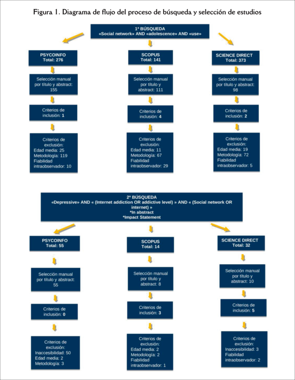 El estudio se efectuó atendiendo a la guía ofrecida por el manual de revisiones sistemáticas de Cochrane en Higgins y Green (2011), en el cual se estipulan objetivos claros, así como términos relacionados con la elegibilidad de los criterios para la selección de estudios. La codificación de los estudios se realizó de forma manual, dado que su mayoría no hacía una referencia explícita a la adicción o uso excesivo de las nuevas tecnologías y depresión. En primer lugar, se estableció la necesidad de codificar los términos en una misma categoría: «adicción», «uso excesivo», «adicción a Internet», «uso medio y alto», «uso problemático de Internet», «consecuencias negativas del uso de dispositivos móviles» y «uso problemático de Facebook» como uso problemático.
