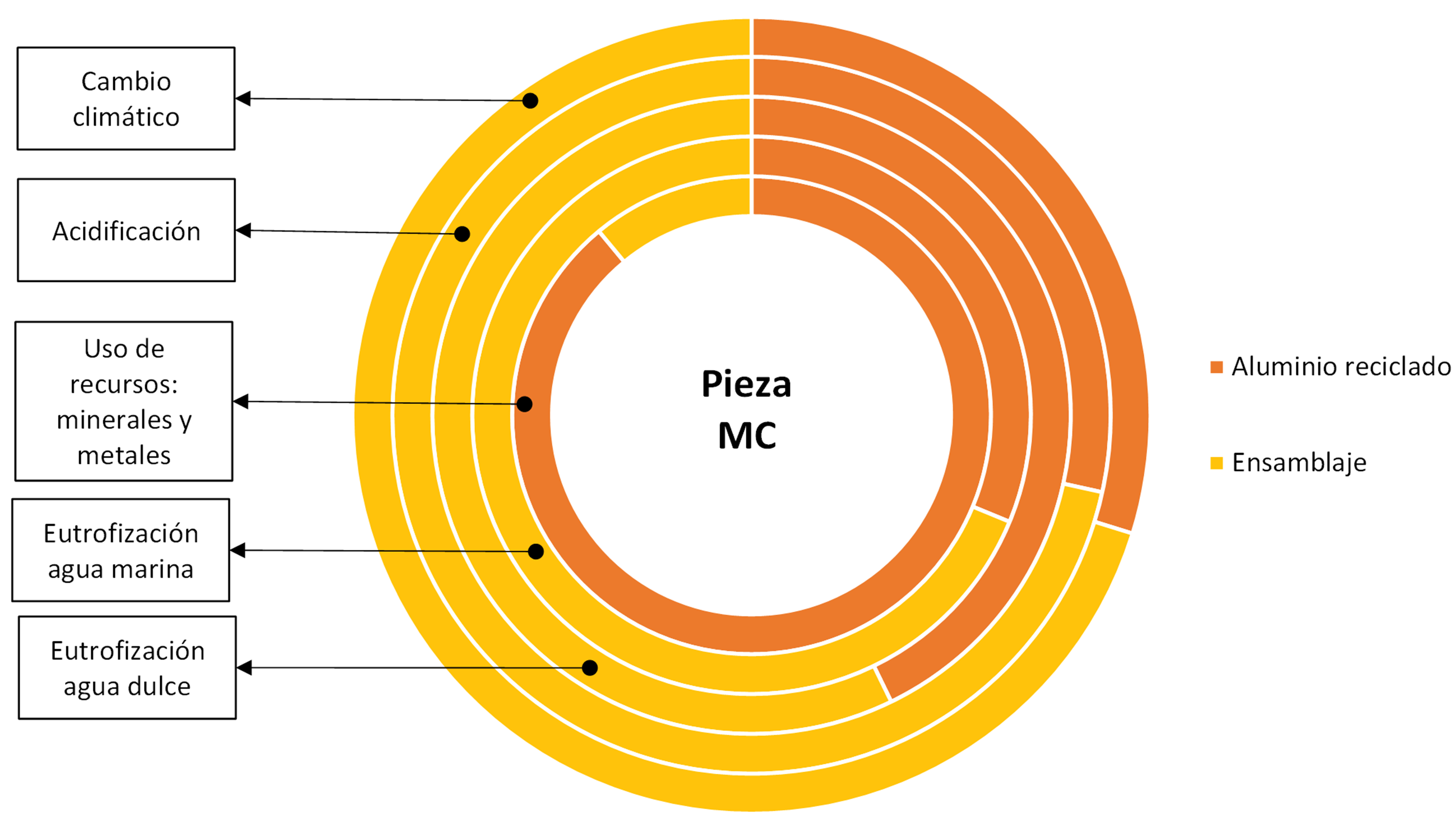 Si se tiene en cuenta únicamente el impacto del material, hay que indicar que sigue siendo más favorable medioambientalmente el aluminio reciclado frente a la fibra de carbono reciclada.