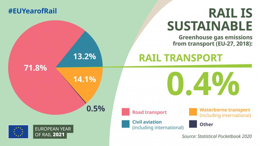El ferrocarril representa tan solo el 0,4 % de las emisiones de gases de efecto invernadero del sector transporte de la UE, mientras que todo el transporte de la UE representa el 25% de las emisiones totales de la UE.