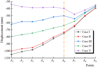| Figure 8. Vertical displacements of key points A1-A9 in different cases |