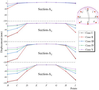 Along the direction of the tunnel axis, it can be seen that the deformation of all key points in Sections A1-A4 has decreased, especially in areas of large deformation such as arches and side walls. For example, the displacement of key point B in section 1-4 under condition 1 is 14.4 cm, 11.7 cm, 8.8 cm and 3.7 cm respectively, and the displacement in section 1-4 under condition 4 is 4.0 cm, 3.4 cm, 1.7 cm and 0.65 cm respectively. This indicates that the deformation of the tunnel structure is maximum in the early stages of excavation and that the tunnel becomes increasingly stable as excavation progresses.