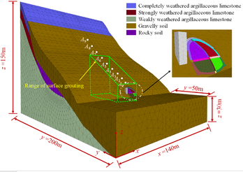 Pre-supports were implemented to enhance the mechanical properties of the surrounding rocks and mitigate the impact of the landslide. Surface grouting was carried out to improve the quality of the surrounding rock at the entrance of the landslide. Figure 3 shows the layout of surface grouting, which adopted a mm PVC plastic flower tube with staggered holes on the tube walls every 15 cm. The grouting slurry, consisting of 1:1 cement mortar, had a total grouting volume of 1014.0 m3. The grouting range extended 13.0 m horizontally from the tunnel's center line, both to the left and right. Longitudinally, it spanned from Chainage ZK177+618 to Chainage ZK173+558. The grouting depth was at least 3.0 m from the original surface to weakly weathered bedrock. The pipe roof provided strong support for the surrounding rock above the tunnel by using high-strength steel pipes around the arch, as shown in Figure 4. The pipes were 40 m long and made of mm hot-rolled seamless steel, with small holes arranged in a plum blossom pattern. The drilling and steel pipes were parallel to the centerline of the line, with an elevation angle of 1°~3° from the horizontal plane. The length of overlap for the pipe shed must be at least 2.0 m, with a circumferential spacing of 40 cm. The grouting slurry used for the pipe consisted of 1:1 cement mortar, with an initial grouting pressure of 0.5-1.0 MPa and a final grouting pressure of 2.0 MPa. Following completion of the grouting process, 30# cement mortar was added to increase the strength and stiffness of the steel pipe. The main purpose of the anti-slide pile was to prevent sliding, as shown in Figure 4. It was located on the outer side of the tunnel, 7.5 m away from the centreline, and had a length of 20.0 m and a square cross-section with sides of 2.0 m. The top of the anti-slide pile is flush with the excavation contour line of the tunnel.