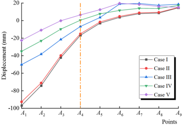 The displacement changes of key points A1-A9 in Case V, as shown in Figures 7 and 8, are consistent with the variation patterns observed in other cases. However, the deformation values are smaller than those in other cases. To compare the effect of multiple pre-supports and single pre-support, the reduction rate of horizontal displacement of each key point in Cases II-V was calculated.