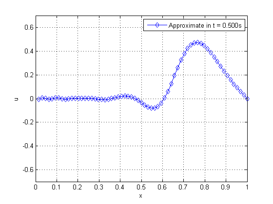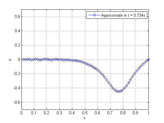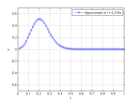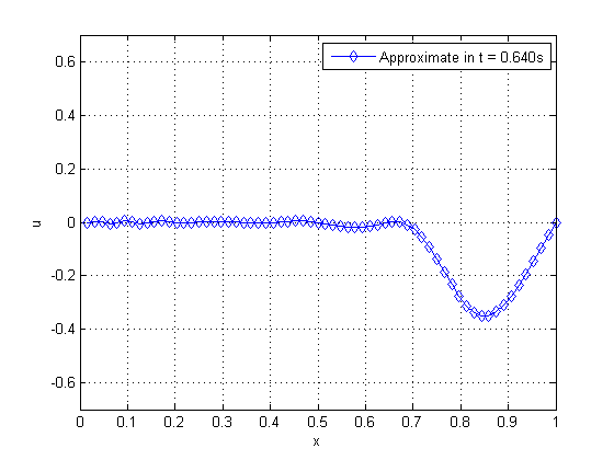 Here we approach a more realistic problem that is solved by approximation. We admit , , , initial configuration and velocity , , that is, we have a straight string in rest position in the initial time, fixed at both ends. Time can be divided in the intervals , where the is the time in which the oscillation reaches the maximum displacement. Then, we apply a pulse in the extremity , between the interval . This pulse can be inserted into the problem, given by the following boundary conditions