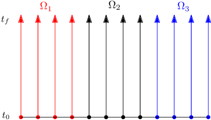 In Gander et al. [11] there is a variation of the Waveform Relaxation method, which can be applied to PDEs, where the domain is divided into spatial subdomains. Remember that each point is solved independently and continuously until the final time, which generates a parallelizable strategy. See Figure 4 for .