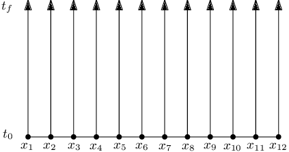 where is the dimension of the system and the notations and with indicate respectively, the initial configurations and velocities, for each point of the spatial discretization. Each line of the system of Eqs. (33) can be solved separately using a core for each line, as illustrated in Figure 3 for .