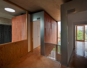 Se trata de un conjunto de viviendas pareadas ubicadas en el límite de la ciudad de Barcelona, lindando el espacio natural de Collserola. La edificación se organiza en tres plantas, una planta sótano de aparcamiento, instalaciones y almacén, una planta baja donde se distribuye la zona de día y una planta alta de dormitorios y estudio; la adaptación progresiva a la topografía permite una estrecha relación de cada planta con el espacio exterior. La propuesta se concibe, en su totalidad, desde la integración de sistemas industriales ensamblados. La percepción de las viviendas desde la calle es de cuatro volúmenes, cuatro módulos autónomos, industrializados y ligeros; son estos módulos los que generan y delimitan el espacio interior y exterior de la vivienda, aportando una complejidad volumétrica y espacial así como permitiendo visuales diversas, tanto des del exterior como des del interior. Una única cubierta ajardinada recoge la volumetría de los módulos. Toda la edificación ha partido de criterios medioambientales y de sostenibilidad, priorizando el comportamiento pasivo, que permita una reducción del impacto ambiental y de demanda energética. Se priorizan las ventilaciones cruzadas naturales. Se introducen sistemas activos de ventilación natural. La vegetación se integra a la arquitectura y es elemento indispensable en el buen comportamiento bioclimático. El principal elemento industrializado son sus módulos tridimensionales de 12m de longitud x 3m de ancho, compuestos por pilares metálicos y losa de hormigón y que incorporan en su envolvente un sistema integral, desarrollado por un panel metálico de 2.80 x 0.60 con un aislamiento de lana de roca y unos perfiles que sustentan tanto los tabiques interiores como la fachada ventilada cerámica. Las viviendas se han desarrollado desde sistemas pasivos y activos de reducción y eficiencia energética. El proyecto se ha desarrollado considerando como aspecto prioritario, la conexión de las estancias y su orientación solar y de vientos dominantes, para favorecer la ventilación natural cruzada: por un lado, la vegetación como elemento esencialmente constructivo que aporta confort y optimiza la refrigeración natural. Por otro lado se incorporan unos pozos canadienses, como sistema activo de ventilación natural. Un conjunto de conductos, enterrados bajo la planta sótano, por los que circula aire permite un intercambio de calor con el terreno. Este aire, más fresco en verano que el aire exterior y más caliente en invierno, es impulsado hacia el interior de la vivienda, aportando confort y reduciendo el consumo de energía convencional. Todas las aberturas orientadas a Sur-Oeste de las viviendas disponen de protecciones solares. Los módulos tridimensionales de planta segunda vuelan sobre el estar ejerciendo de porche y por tanto de umbráculo en verano.