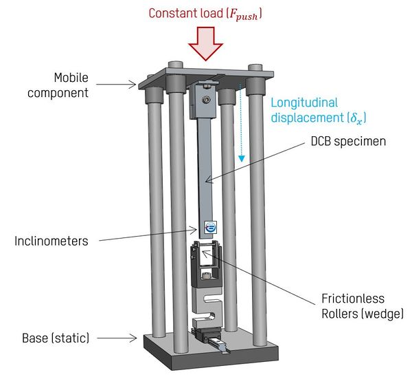 In addition, a new test rig enabling the simultaneous application of a constant load and environmental conditions to bonded joints was developed (figure 9). The new test method applies a constant to a bonded joint that is exposed to environmental conditions. A wedge is inserted in a DCB specimen that is clamped to the frame of the test rig and its crack tip is stressed until the desired time of exposure is completed. Using the WDT+ for durability tests, both the applied load and the energy available to crack the adhesive remain constant throughout the duration of the test and thus, either the crack growth rate or the opening angle are stable. The ERR is continuously evaluted following the WDT+ data reduction method so that the evolution of damage can be monitored.