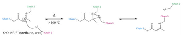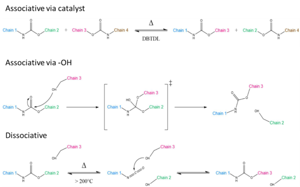 La reacción de transcarbamoilación de grupos de carbamato en poliuretanos puede seguir diferentes vías, dependiendo de las unidades químicas involucradas: asociativa mediante el empleo de un catalizador, asociativa a mediante la adición nucleófila de grupos OH y disociativa. La ruta disociativa es muy indeseable, ya que a menudo se asocia con reacciones secundarias indeseadas a altas temperaturas[24].