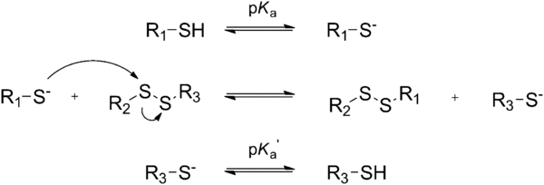 El mecanismo de intercambio tiol-disulfuro implica el desplazamiento nucleofílico de un anión tiolato del disulfuro, mediante el ataque de otro anión tiolato[65–68].