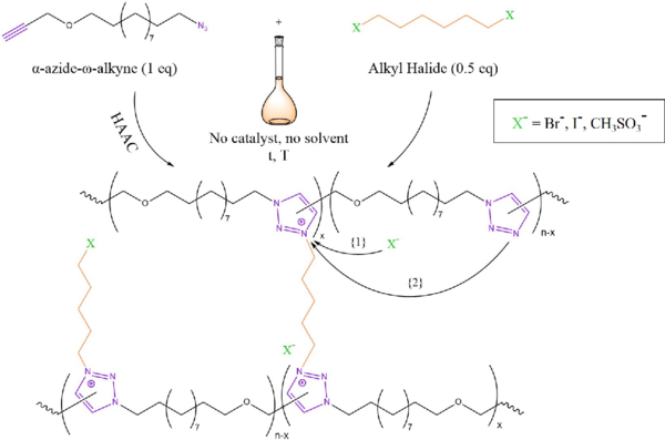 Estas redes poliiónicas se sintetizaron mediante un proceso de un solo paso a través de una poliadición de monómeros de α-azida-ω-alquino que implicaba una cicloadición Huisgen 1,3-dipolar (HAAC) de azida-alquino "sin clic" térmica y una reticulación simultánea con un agente de cuaternización de haluro de acilo.
