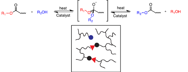 La reacción dinámica de transesterificación ocurre entre un éster y un alcohol para formar un nuevo éster y alcohol hasta que se alcanza el equilibrio, y esto generalmente requiere temperaturas elevadas y catalizadores como ácidos de Lewis o bases de Brønsted fuertes[49,50].
