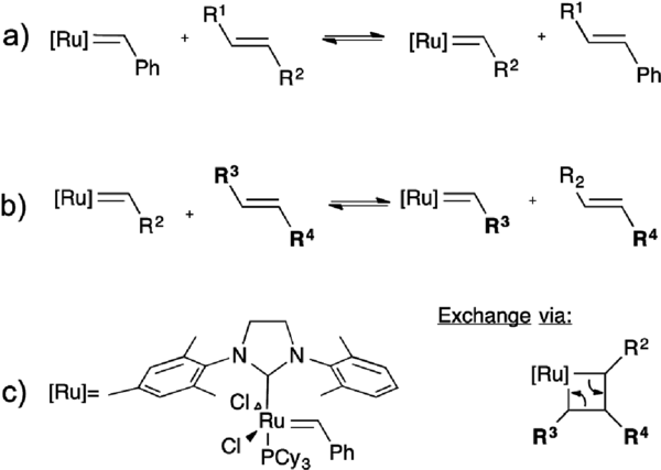 Guan y colaboradores demostraron las posibilidades de la reacción de metátesis de olefinas en redes de polibutadieno reticulado que contienen catalizador Grubbs de segunda generación[60–62] :