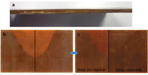 Para investigar la capacidad de reparación del material compuesto dinámico, primeramente se indujo una delaminación en una placa de fibra de vidrio de 2 mm de espesor, para lo cual se introdujo por uno de los laterales del laminado un elemento punzante entre las capas centrales. Posteriormente la mitad de la placa se sometió a un ciclo de compresión a una temperatura de 200ºC y 50 bar durante 5 minutos, lo que hizo desaparecer la delaminación de esa zona, tal y como se observa en la Figura 4.