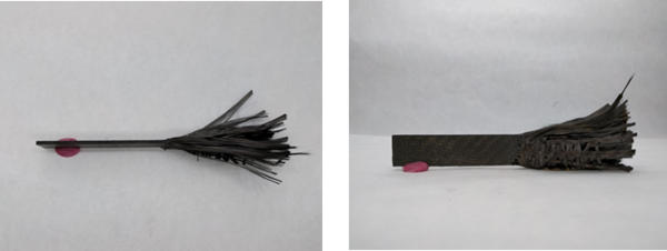 Con el fin de demostrar el reciclado químico de los laminados dinámicos, se sumergió una muestra de un laminado de fibra de carbono de 2 mm de espesor en una solución de un agente reductor, concretamente el 2-mercaptoetanol (0,2 ml) en DMF (20 ml) durante 24 horas a temperatura ambiente. Como puede verse en la Figura 6, las fibras de carbono quedaron totalmente limpias después de la completa disolución de la matriz.