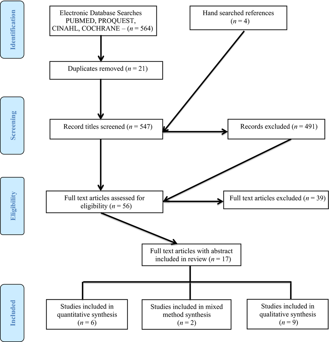 The initial search outcome generated 564 studies. After 21 duplicates were excluded, the titles and abstracts of these studies were retrieved and read. DM and VA screened the title and abstract of each article. If initial screening indicated the paper was suitable for inclusion, the whole manuscript was read. If any doubt or uncertainty existed, the third author, WC assessed the paper and the three authors reached consensus. From, initially identifying 568 articles, removal of duplications and the screening process led to 56 potential articles. From those, 17 articles were included in the review (Figure 1). Based on the ‘Preferred Reporting items for Systematic Reviews and Meta-analyses: the PRISMA statement’ (Liberati et al. 2009), Figure 1 shows the flow of information through different phases of the review. The PRISMA statement was used to structure the review and systematically report findings (Liberati et al. 2009) Figure 1.