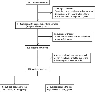 In a 3-year prospective cohort study, we recently reported that the annual rate of change in FEV1 among patients with well-controlled asthma was highly variable and the rapid decliners were more likely to have higher levels of FeNO at baseline.14 In this subsequent analysis, we first determined the FeNO cut-off point for identifying patients with an accelerated decline in FEV1. Next, the patients who maintained high or non-high FeNO were selected, and the associations between the FeNO trend and changes in FEV1 and bronchodilator response (BDR) were investigated.