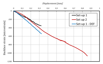 Regarding damage sensing following a back strain monitoring approach, Figure 7 shows the measurements recorded during quasi-static tests by equipping a specimen for each case. The results obtained highlight a compressive stress state in the central joint overlap zone corresponding to the position of the SG. By comparing set-up 1 specimens with and without defect placed in the weld interface, failure occurs at the same imposed displacement but the specimen with defect has a higher stiffness associated with a different distribution of peel and shear stress concentration occurring at the edge of the overlap. In the case of set -up 2 specimens, higher levels of surface deformation are achieved due to the higher stress state that characterizes this case as shown in Table 2.