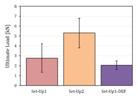 Figure 5 displays the results of the single-lap shear tests. Induction welds manufactured by set-up 1 processing parameters have an average ultimate load around 2.8 kN. Corresponding welds obtained with the same process parameters but having an artificially generated defect have lower static properties (around 2.1 kN) as expected due to the smaller welding area. Set-up 2 processing parameters give better static mechanical properties than set-up 1 ones with an average ultimate load of 5.8 kN. The greater properties of set-up 2 are attributed to the higher welding quality that can be achieved throught the process parameters employed. The lower travel speed of set-up 1 as reported in Table 1 is equivalent to longer time of exposure of the workpiece to the induction field. Longer time of exposure usually results in a higher quality of weld because more polymer chains are given time to move across the weld interface. However, excessively long times leads to thermal degradation of the polymer and a consequent degradation of weld strenght[8]. Therefore, the lower mechanical properties of the welds obtained with the set-up 1 processing parameters could potentially be related to this cause. At the same time, looking at the coil excitation voltages, the lower power input of set-up 1 may mean that the amount of heat generated proportionated a reduced movement of the polymer chains across the weld interface respect to set-up 2 condition. The analysis of the fracture surfaces is being carried out by the authors in order to better understanding to which of the two scenarios the change in mechanical performances is imputable.
