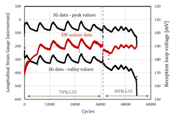 Figure 8 shows SG and EM sensor post-processed signals obtained during the fatigue test carried out on set-up 1 specimen. The SG can detect the approach of the failure condition as visible by observing the signal drift towards the last cycles. The EM sensor signal follows exactly the same oscillatory pattern as the SG signal. In fact, SG is a conducting material where a current passes through which and, when in motion, generates a magnetic field that influences the voltage induced in the EM sensor reception loop. Dedicated further tests are necessary in order to actually be able to make an assessment of the capabilities of the EM sensors. Firstly, the edge effect has to be eliminated by repeating the test with a larger specimen, a configuration that is furthermore closer to the working condition of the sensor during the operational life.