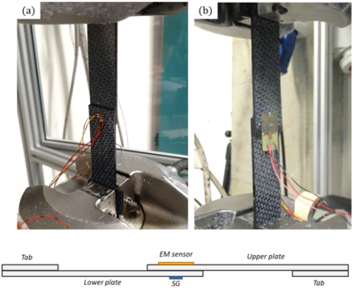 During static and fatigue tests, strain gauge (SG) were installed in one of the adherents backface centered in the overlap area as shown in Figure 4. On the opposite face the EM sensor is installed so that emission and reflection loops are centred in the overlap zone.