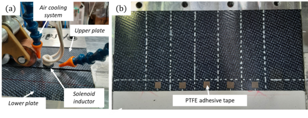 Figure 1 (a) Relevant components of Induction welding system. (b) PTFE adhesive tapes placed in the joint line for obtaining defective welds in a fully controlled way.