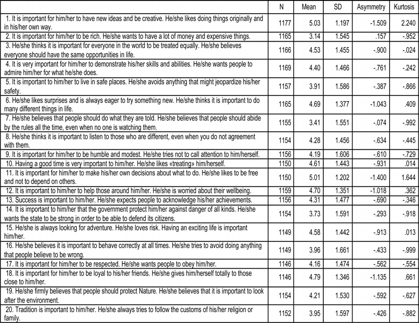 In the first analysis, as shown in Table 2, the highest means were obtained for self-direction (items 1 and 11), with means of 5.03 and 5.01 respectively, followed by benevolence (items 12 and 18), with means of 4.70 and 4.79 respectively. On the other hand, the values with the lowest means were item 2 (power), with a mean of 3.14 and items 7 and 16 (conformity), with means of 3.41 and 3.96, respectively. We believe it is important to highlight the fact that self-direction can be understood as an individualistic value, while benevolence is conceptualized as a collectivist value.