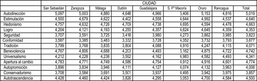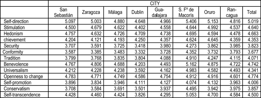 On an initial reading, clear differences emerge between the different cities; thus, San Sebastián, followed by Zaragoza, have the highest means (5.097 and 5.003 respectively) in the self-direction dimension.