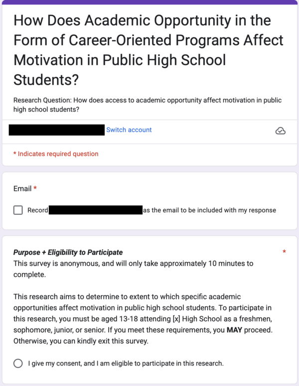 To assess the relationship between academic opportunity and student motivation, an anonymous online survey was conducted via Google Forms. Given the study’s sensitive topics, such as motivation and cultural pressures, an online survey was deemed more appropriate than interviews to encourage honest responses.