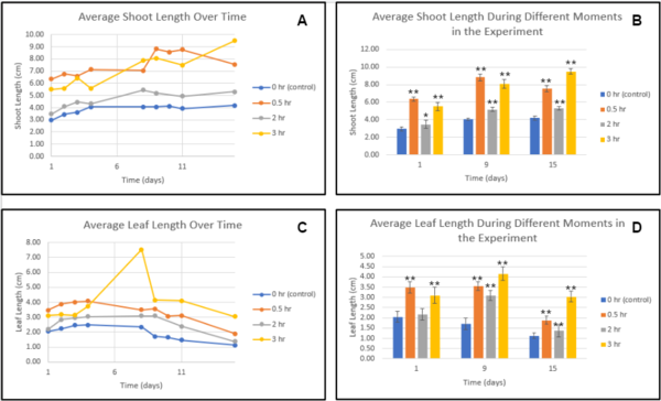 Figure 2. Average shoot/leaf length over time-Trial 2. Each line or bar represents a different amount of treatment of the sound of stream water. There were 10 plants per group. Error bars represent the standard deviation. Generally, increased treatment lead to increased growth (except in the case of the 2 hr group), even through the later phases of drought stress where withering occurs. ANOVA followed by Tukey HSD was conducted to determine the significant difference *p<0.05, **p<0.01 compared with the control group.